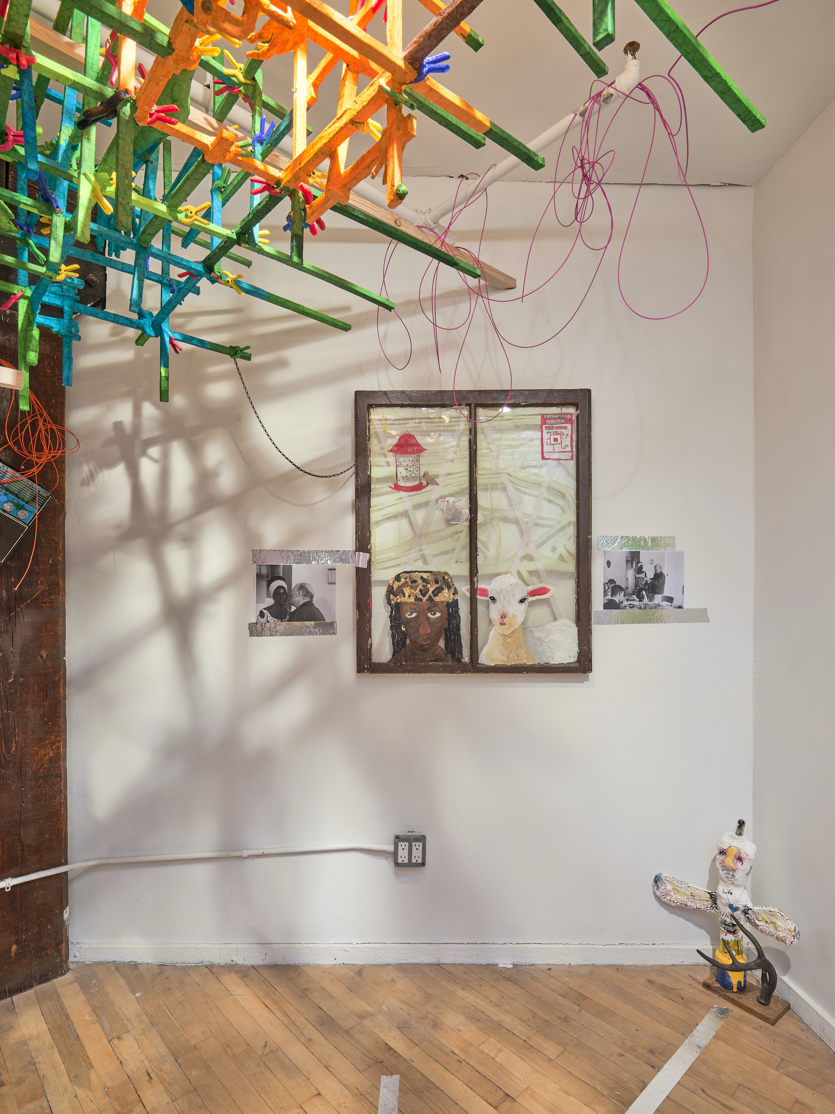 Pap Souleye Fall draws on internet subcultures and online fandoms—specifically the Black Otaku community—to develop an ever-expanding cosmology of images and objects. Spanning video, performance, comic book art, cosplay, and installation, Fall conceives of their multidisciplinary output as akin to fan art: DIY artifacts for the imaginary narratives that undergird their practice. Modalities of speculative fiction, gameplay, and comics serve as potent creative engines, providing strategies by which members of the African diaspora might navigate and transcend systems of global oppression. Central to Fall’s recent work is DEAD PIXEL, a growing constellation of ideas encompassing brightly colored reliefs, quasi-architectural environments, and chroma key green bodysuits adorned with cowrie and peanut shells. Through the repeated invocation of the green screen, Fall explores dynamics of visibility and invisibility, opacity and fugitivity as they merge with the physical and virtual spaces of the present.