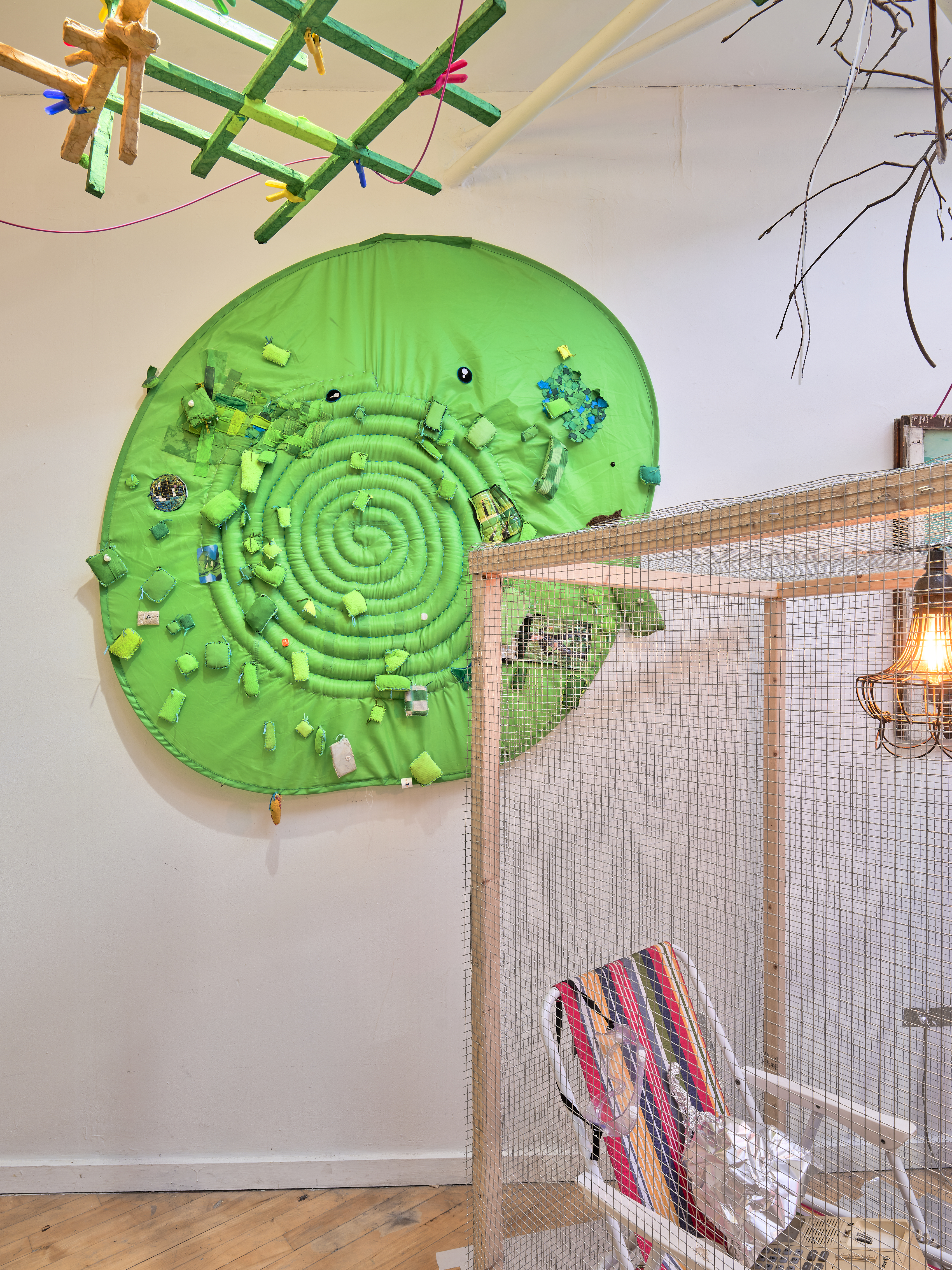 Pap Souleye Fall works in rupture—the deliberate fracturing of boundaries between disciplines, spaces, the seen and its conditions of visibility. But rupture here is generative: not wound but passage. Fall’s signature is chroma key green, the color engineered for disappearance, designed to be replaced in post-production by whatever image serves the frame. Fall refuses the substitution, letting the green remain—visible, material, architectural. The color holds the trace of its intended function, vibrating between presence and the erasure it was built to enable. In PIXELATEDBUSHOFGHOSTS (2026), scaffolding and inflatables remade in chroma key green extend from floor to ceiling, hovering between parasitic and symbiotic. These structures draw from the host architecture while imposing their own formal logic, blocking conventional passage and sightlines. Viewers must crouch and crawl to move through. But obstruction is also reorganization—the same structure that impedes opens alternate circuits of movement, other ways through.