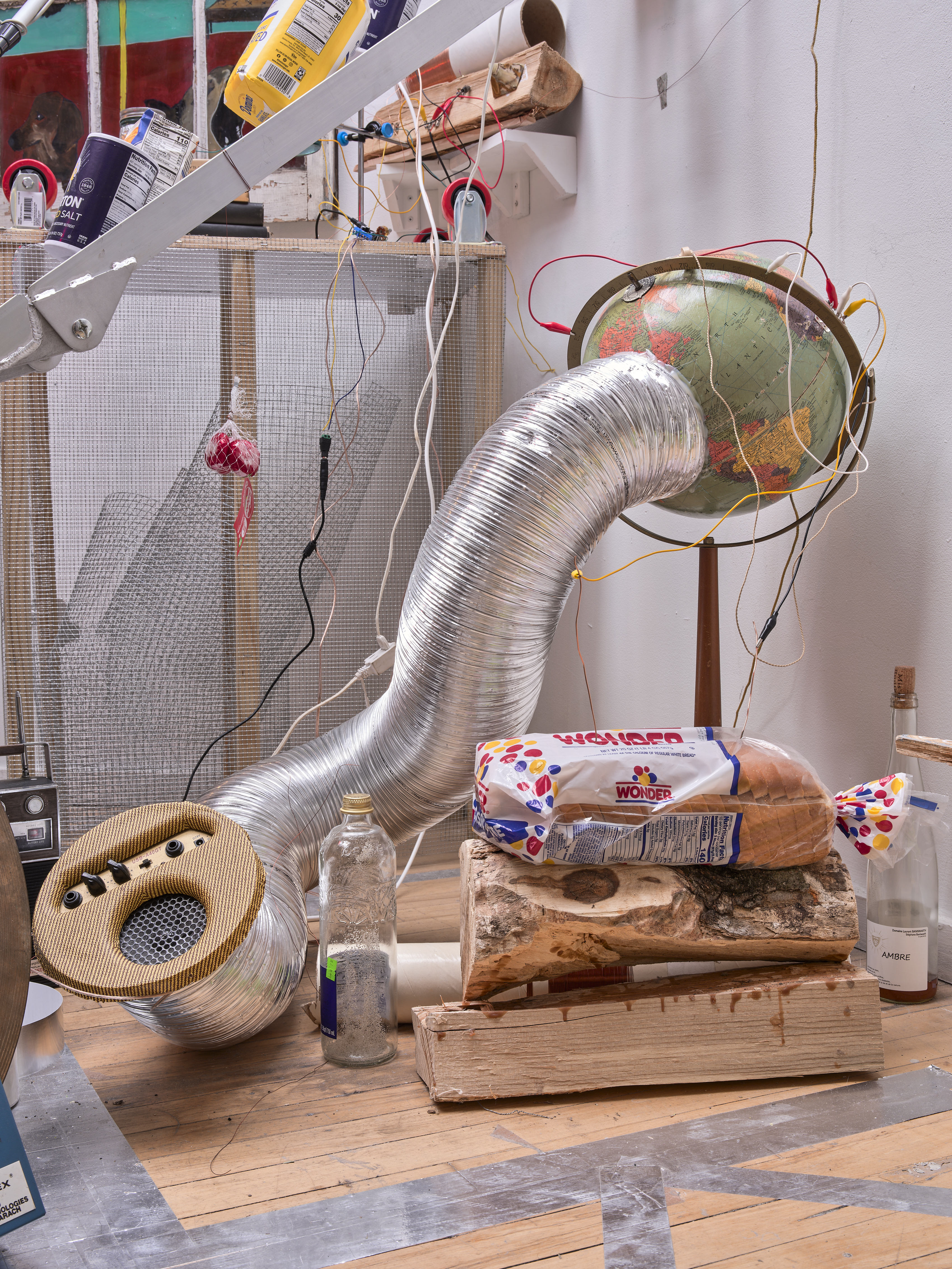 Char Jeré works through Afro-fractalism: a logic of feedback, recursion, and return drawn from African diasporic histories. The fractal is structure, not ornament—a form where repetition produces difference, where futures fold into presents and pasts without collapsing into linear sequence. Against the straight-line temporality of colonial and capitalist modernity, the fractal figures time as spiral: circling, refusing resolution. This logic becomes spatial and sonic in In the AM Garden Where Everything is PM (2026). Detuned radio systems, Faraday cages, metal detectors, and suspended debris form a listening architecture where transmission and containment exist in unresolved tension. Foxhole radios transform refuse into instruments of deception rather than reception. The Faraday cages, typically deployed to shield military and corporate communications from interception, become collective shelters—architectures of opacity where surveillance cannot reach. But shelter is also enclosure—the same opacity that shields from surveillance turns the outside world into static, severing the very connections it protects.