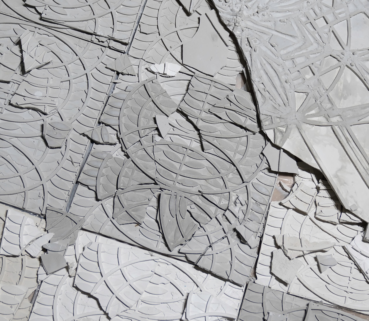 Sculpted tiles clad the surfaces, skylights filter shifting fields of color, and a tape loop traces the edges of the room with faint sound. The exhibition bridges the gap between their studio-based practices and ephemeral nightlife architectures, creating a liminal environment that transports visitors away from the street below into a space of curiosity and careful perception.