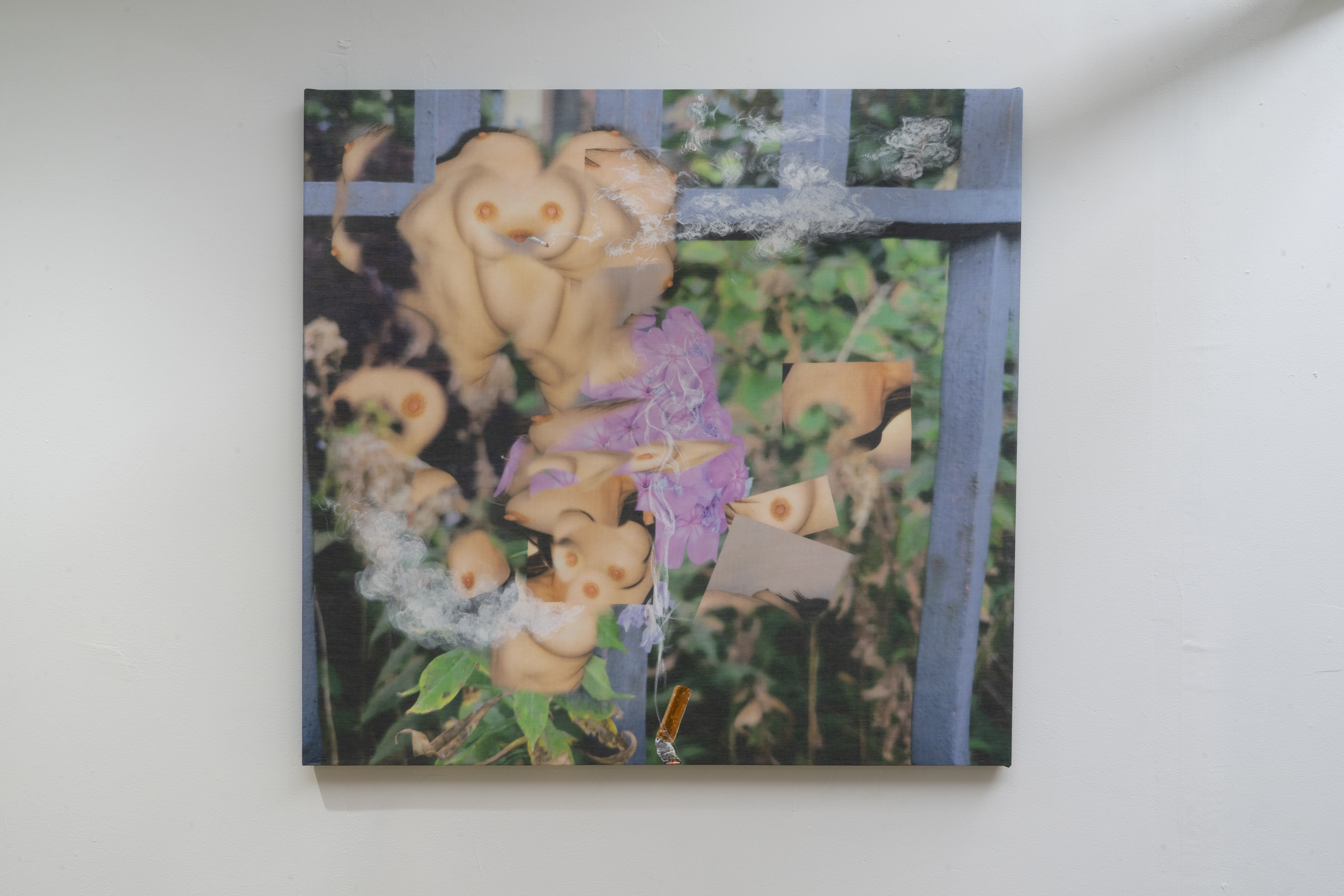 By foregrounding her body, Oh intentionally objectifies herself, a gesture that draws inevitable comparisons to self-exposure in pornographic imagery. However, rather than offering her image for easy consumption, Oh’s work questions the cultural mechanisms that both fetishize and regulate women’s bodies. Her primary method is digital collage; by layering and blending, she deconstructs and reconfigures breasts and nipples, exposing how bodies are flattened and codified into objects or symbols. What might appear sensual or maternal in one context instead becomes something altogether different here—a grotesque yet whimsical presence, severed from its usual associations.