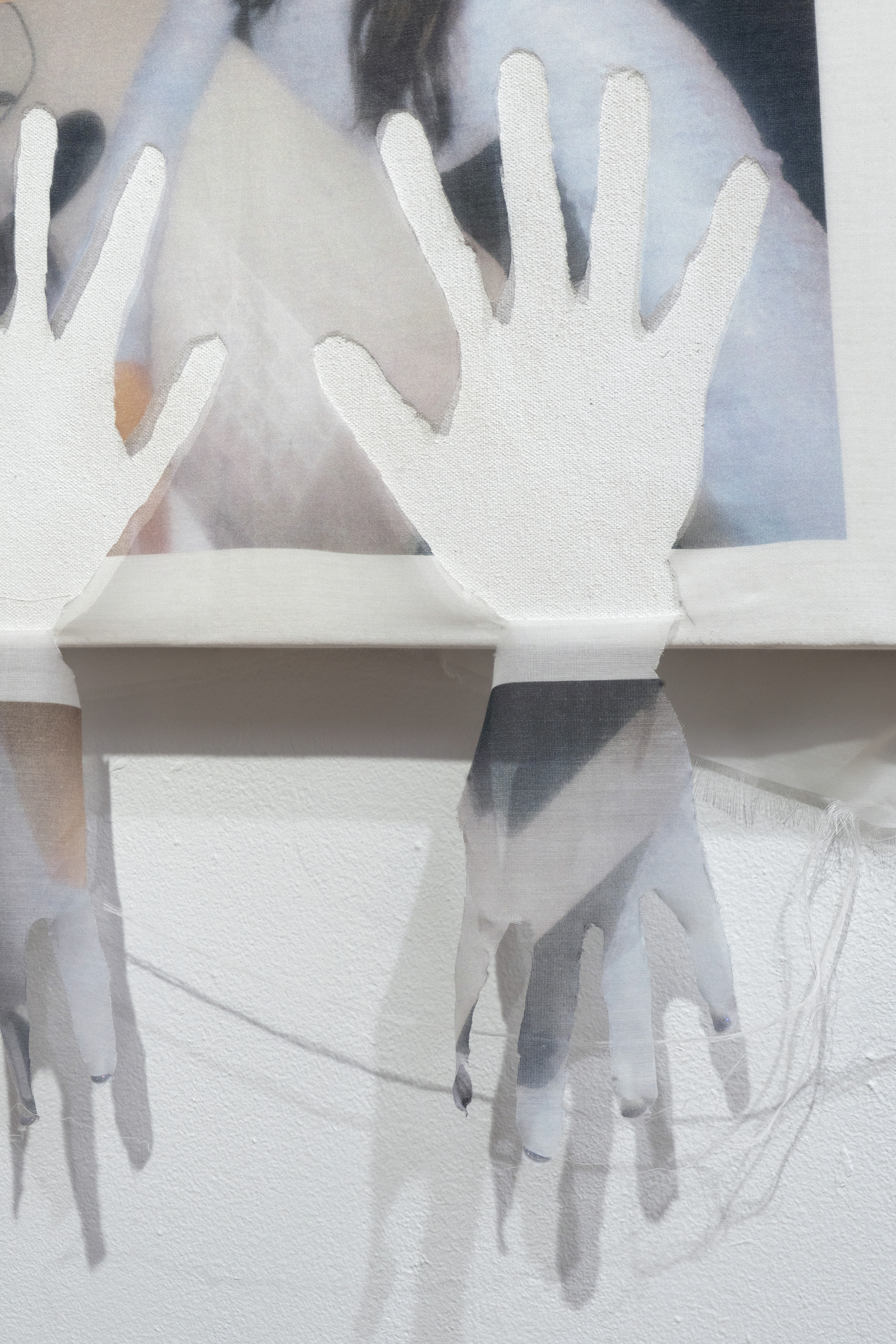 Oh deepens this critique by engaging directly with the materiality of her work. She has long explored not just photographic images but also the technical supports that bear them—surfaces, frames, and their physical manifestations. This practice expands in her current series with the inclusion of silk and soil as integral materials. The silk, with its translucency, evokes an interplay between concealment and revelation, reflecting the tension between how bodies are perceived and how they are projected. Soil, meanwhile, acts as a grounding element—tactile and symbolic. Its capacity to form mounds and curves, along with its inherent instability, parallels the nature of digital collage: fluid and mutable, yet tethered to reality. Together, these materials enrich the themes of dismantling and rebuilding the imagery of the body.